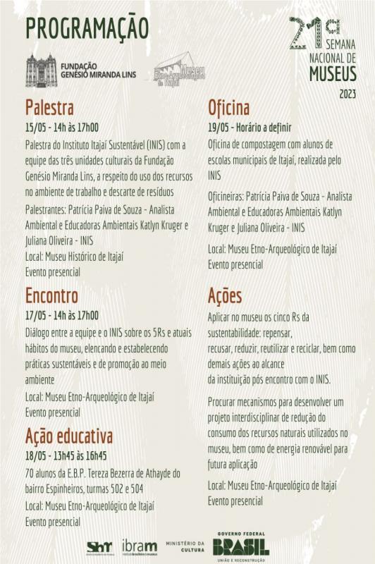 A 21ª Semana Nacional de Museus, promovida pelo Instituto Brasileiro de Museus (IBRAM), começa nesta segunda-feira (15) e segue até domingo (21), com a temática “Museus, sustentabilidade e bem-estar”. Itajaí participa do evento com diversas atividades realizadas no Museu Histórico (Centro) e no Museu Etno-Arqueológico (Itaipava).
