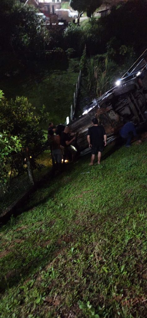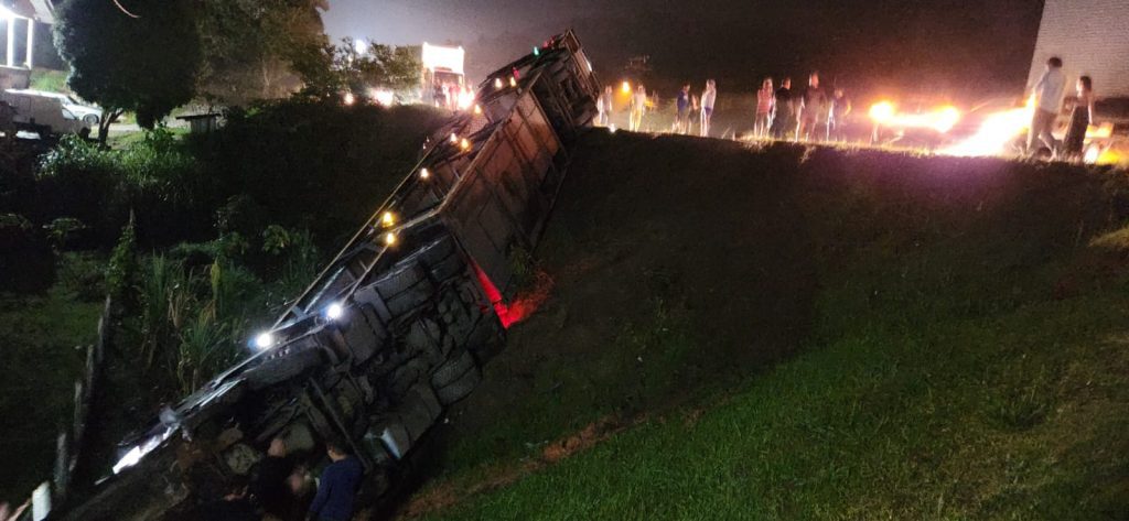 Segundo o CBMSC, após o caminhoneiro capotar com o veículo, um outro caminhão e pelo menos outros dois carros, conforme imagens, também colidiram.